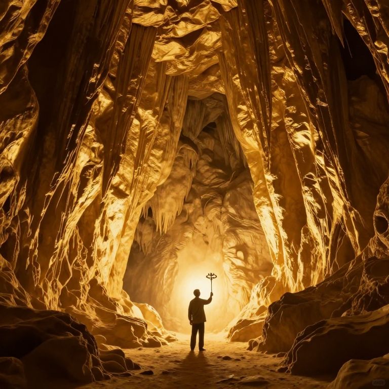 A solitary figure stands at the threshold of a luminous, cavernous world, wielding a mysterious tool as if sculpting the very fabric of memory from the golden, living walls of a cave that seems to breathe and forget with each passing moment of sunlight.