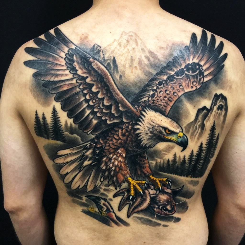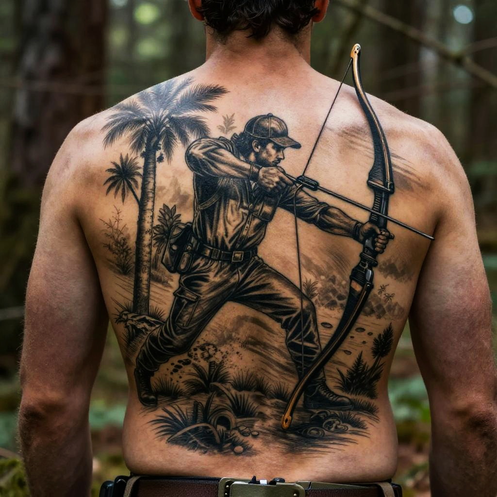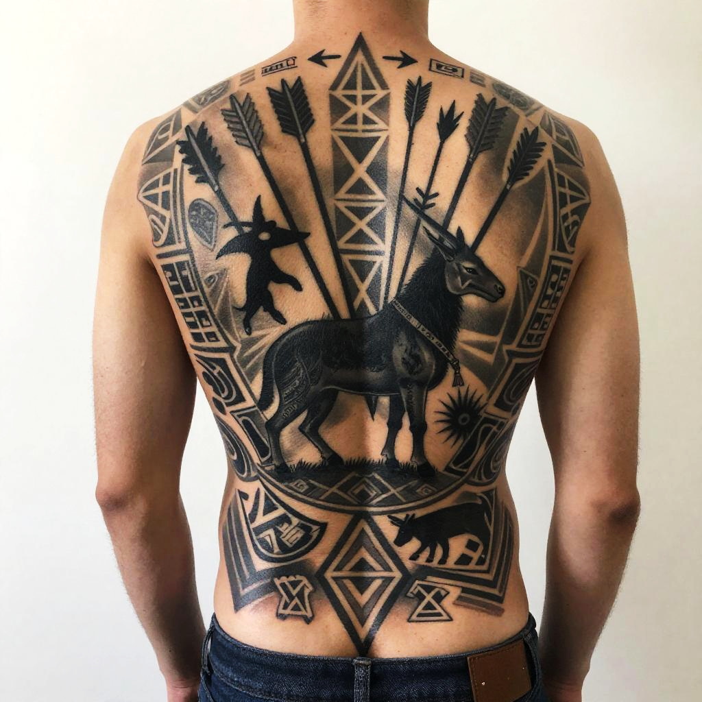 Hunting back tattoo with a fusion of ancient hunting symbols, arrows, and animal silhouettes, large full-back design with complex geometric patterns and soft gradient shadows in monochrome