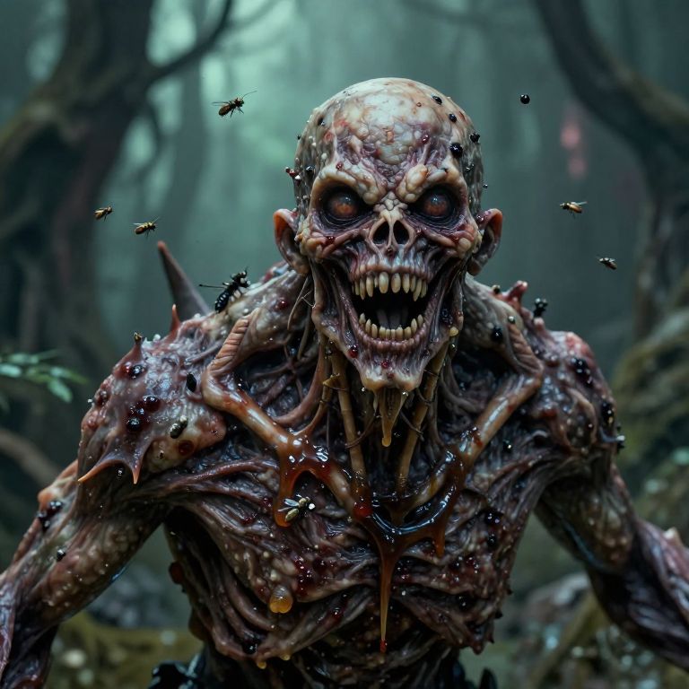 Close-up of Plaguebearer of Nurgle, grotesque, decaying flesh, dim swamp light, insects buzzing, pus and sores, background of diseased forest, malevolent joy in its eyes, atmosphere of decay and corruption