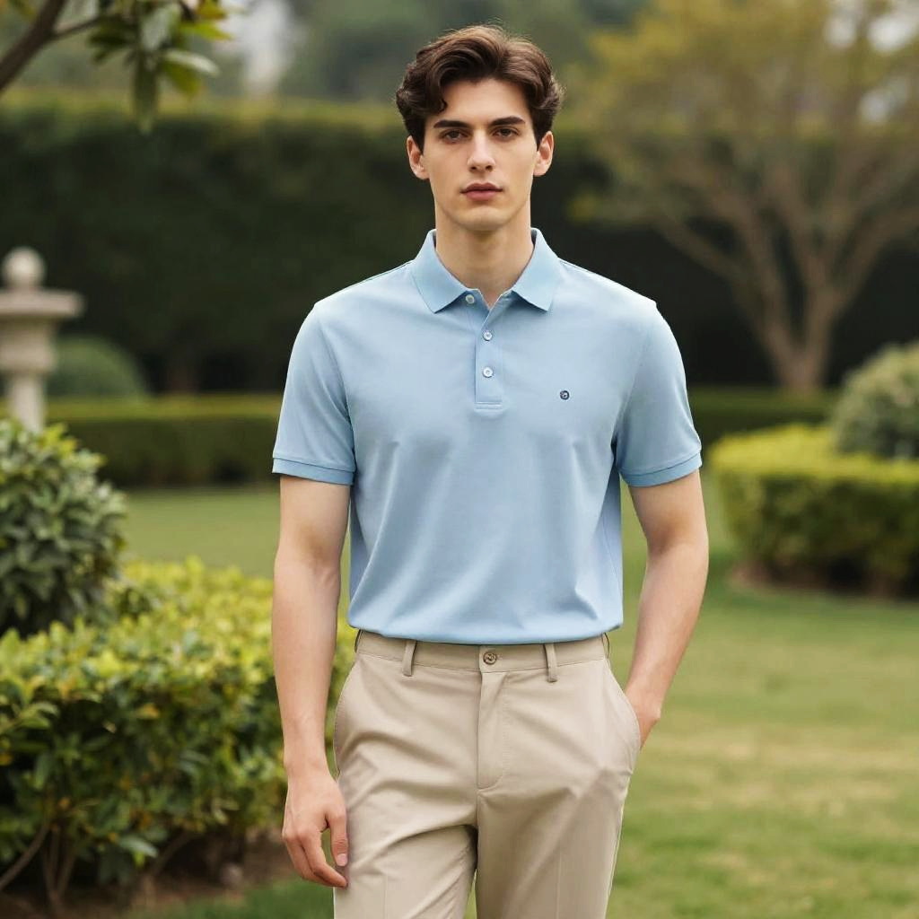 A stylish young man stands confidently in a well-manicured garden, dressed in a light blue polo shirt and beige trousers. The serene outdoor setting highlights the elegance of his outfit, making it perfect for a variety of lifestyle and fashion contexts.