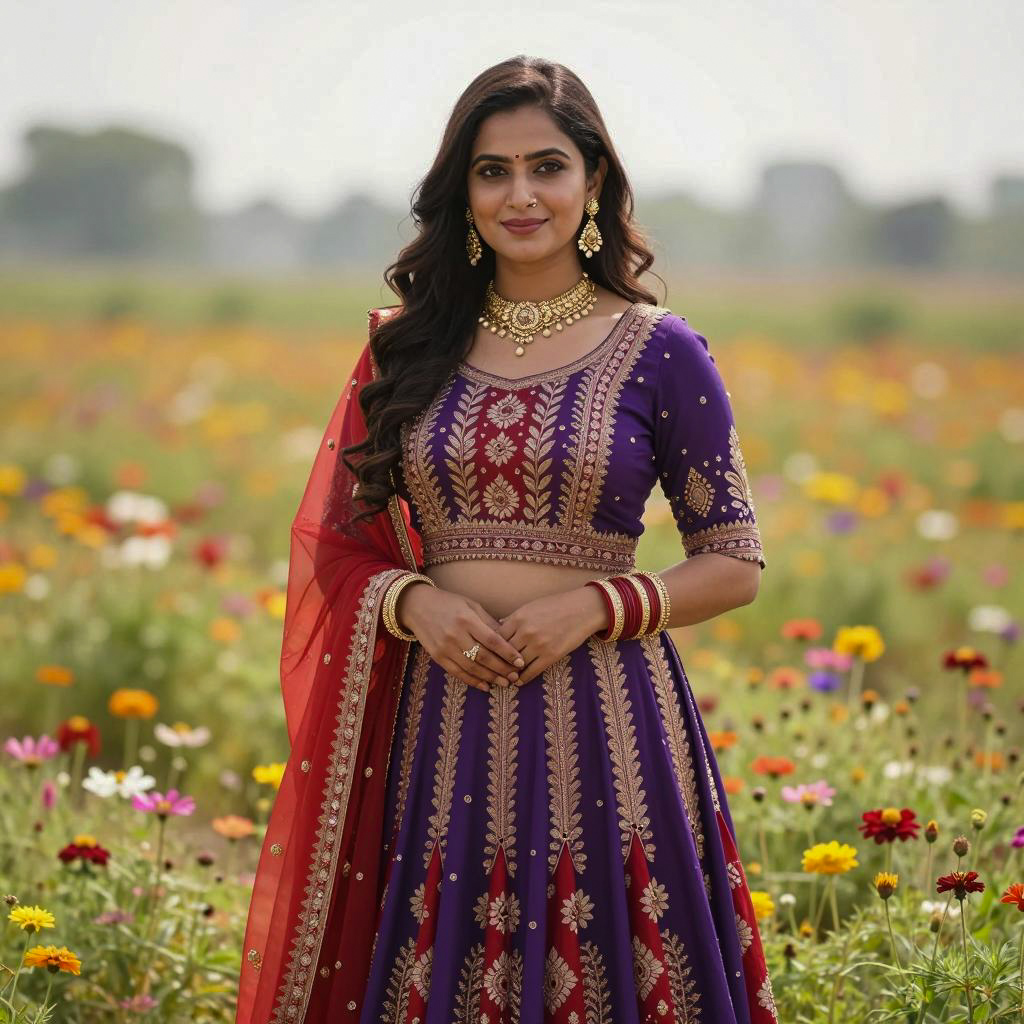 Dulha dress india, photograph of a beautiful Indian woman, standing in a colorful flower field, wearing a traditional purple and red patterned lehenga with a matching red dupatta, long wavy dark brown hair, smiling, natural makeup, wearing gold jewelry, bright sunlight, soft focus background, vibrant colors, summer day, serene expression, bokeh effect, realistic style