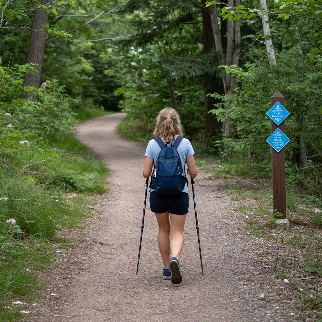 Woman walking along a winding forest path using trekking poles, surrounded by lush greenery and trees, following the Diamond Creek Loop Trail marked by blue diamond signs.