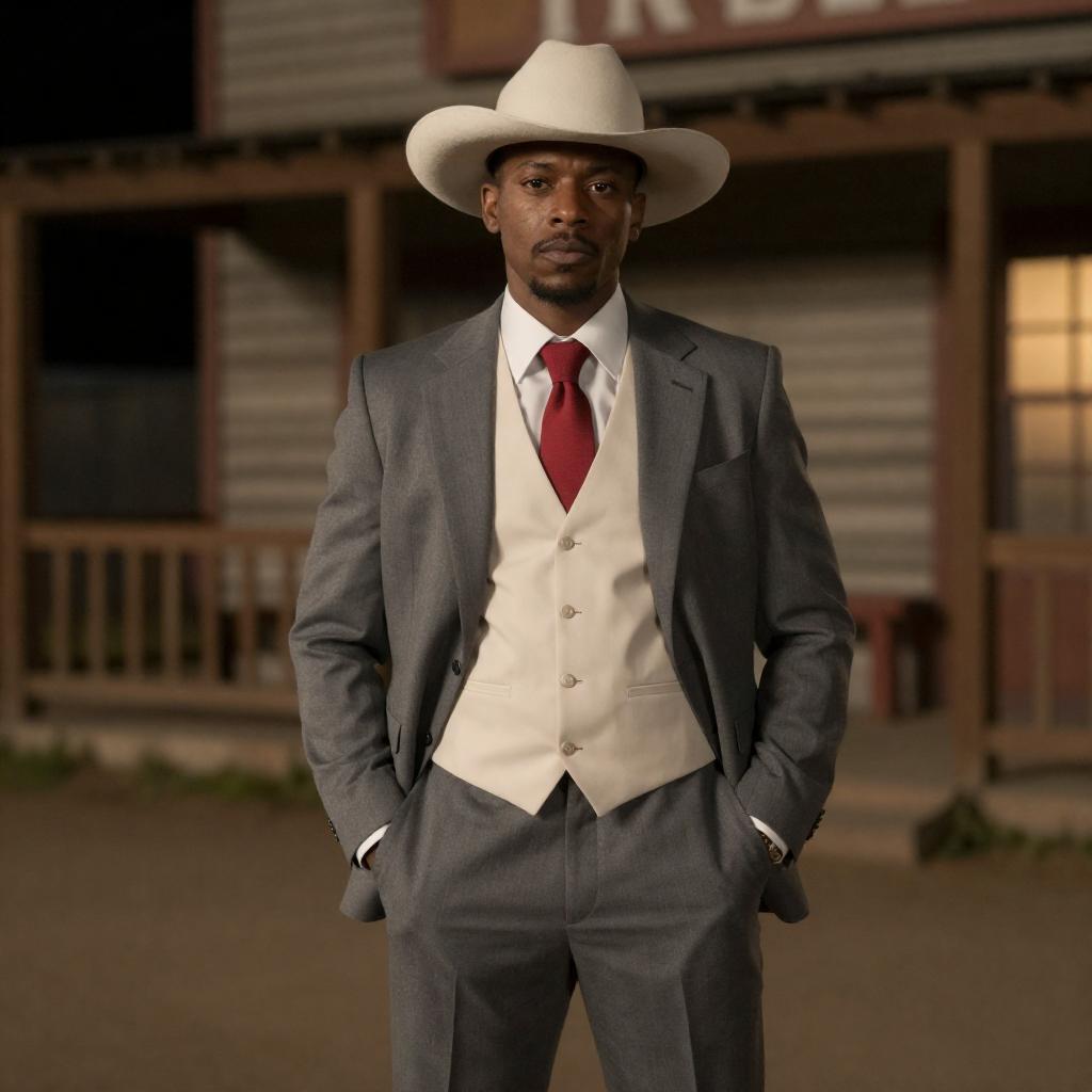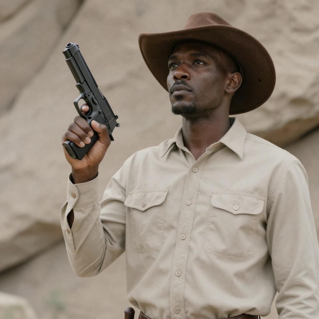 Photograph of a Black man with dark skin wearing a brown cowboy hat and beige button-up shirt. He holds a black handgun in his right hand. He stands against a rocky, beige background, looking upward with a serious expression.