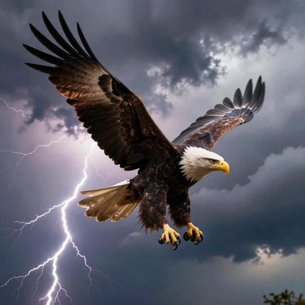 Trump riding eagle in mid-flight above stormy clouds, lightning flashes in background, eagle's feathers ruffled by wind, dramatic high contrast, heroic and cinematic composition
