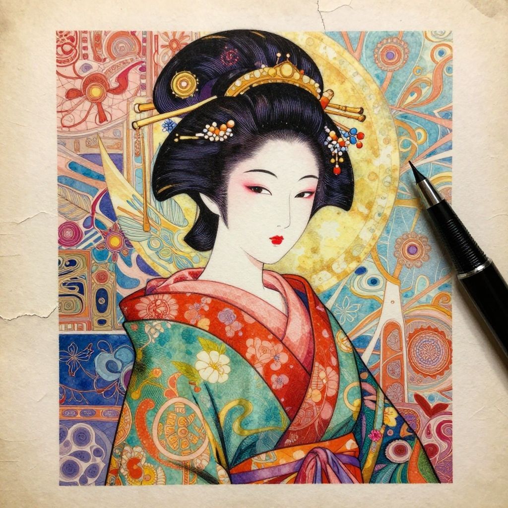 This digital illustration depicts a traditional Japanese geisha with pale skin and red lips, wearing an ornate kimono adorned with vibrant floral patterns in red, green, and yellow. Her black hair is styled in an elaborate updo, decorated with gold hairpins and beads. The background is a kaleidoscope of colorful, swirling patterns in blue, orange, and red, resembling traditional Japanese art. A black pen is placed diagonally in the bottom right corner, adding a modern touch. The image has a textured, aged paper effect, enhancing its traditional aesthetic.