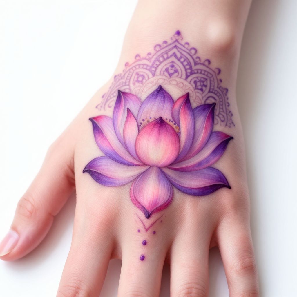 Lotus hand tattoos rendered in vibrant colors blending purples and pinks, with fine mandala elements encircling the flower, creating a mystical and calming vibe, depicted on delicate fingers with soft natural light enhancing the design.