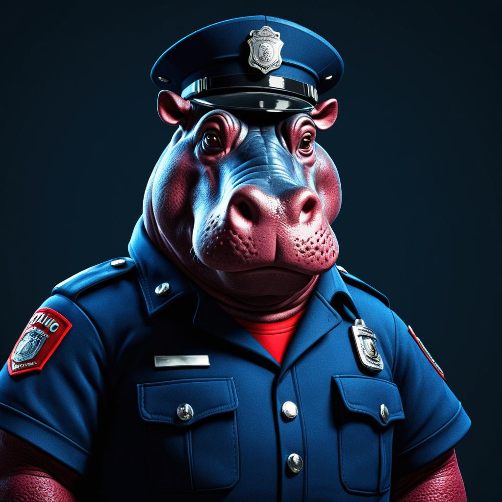 Ultra-detailed digital illustration of a serious blue hippopotamus character dressed in a navy and crimson police uniform. The cartoon-style image features accent lighting and bold lines, showcasing the hippo wearing a police hat and badge with a confident expression.