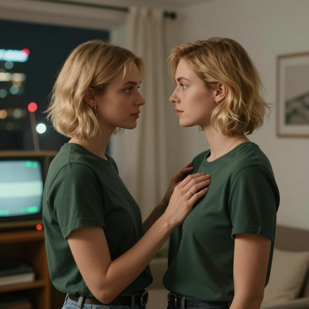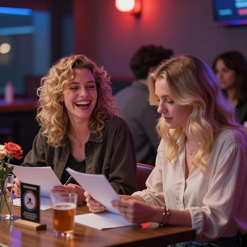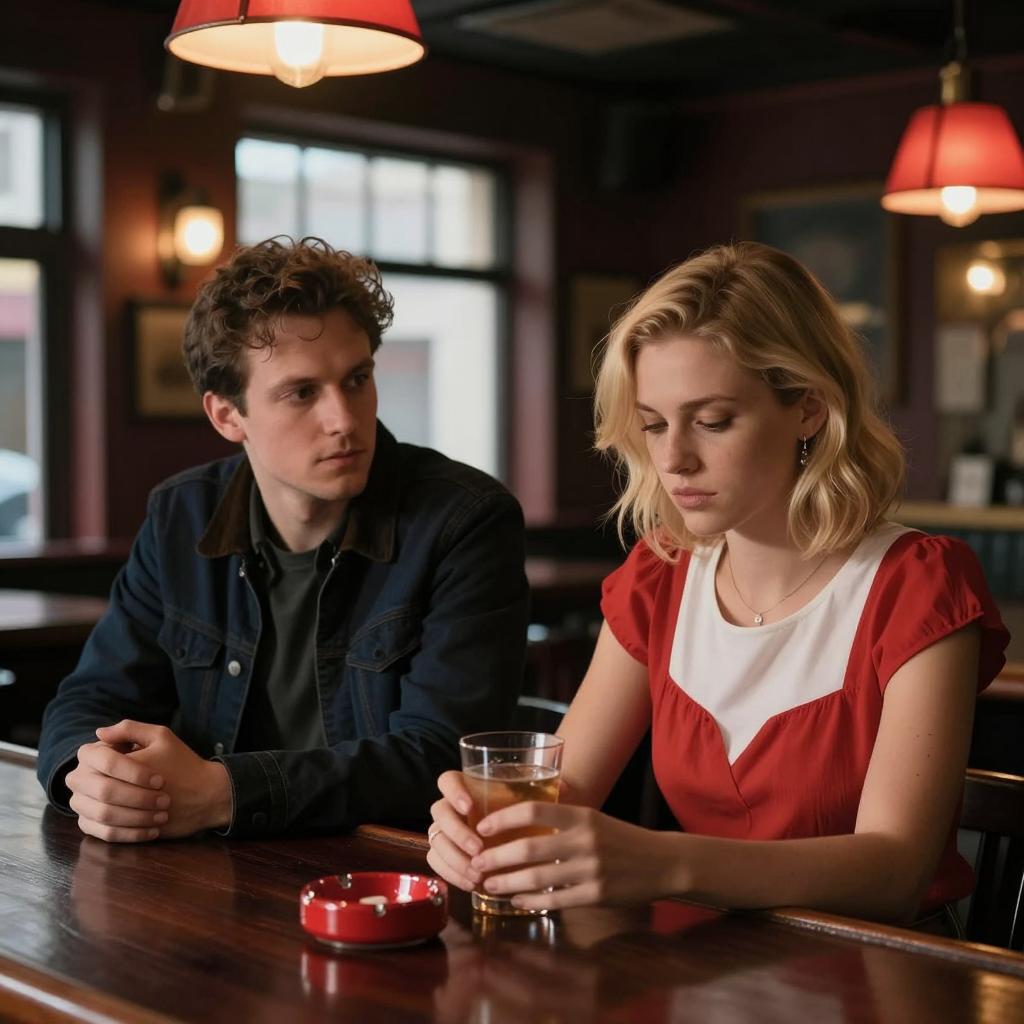 Two women in a dimly lit bar. Blonde woman with short hair in white blouse, looking down. Brown-haired woman in blue sleeveless top, gesturing with hands, looking at blonde woman. Neon "Lite On Tap" signs in background. Drinks with straws on table, red glass vase, napkins. Warm wooden paneling, soft lighting. Intimate conversation.