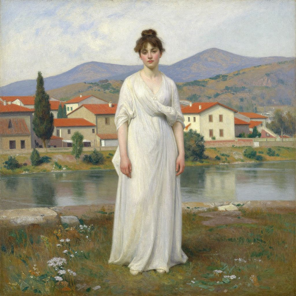 A classical oil painting reminiscent of Jean-Baptiste-Camille Corot's style, featuring a serene portrait of a woman in a flowing white dress, set against a picturesque Italian landscape with red-roofed buildings, a tranquil river, and distant mountains, captured with soft, naturalistic lighting and high-definition detail.