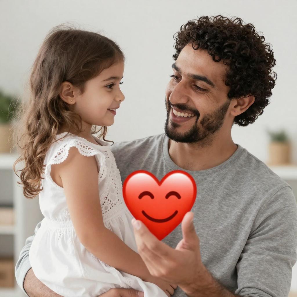Photograph of a smiling Middle Eastern man with curly hair and beard, holding a young girl with long brown hair. He wears a gray shirt, and she wears a white lace dress. A red heart emoji with a smiling face covers part of the man's hand. Bright, blurred background.