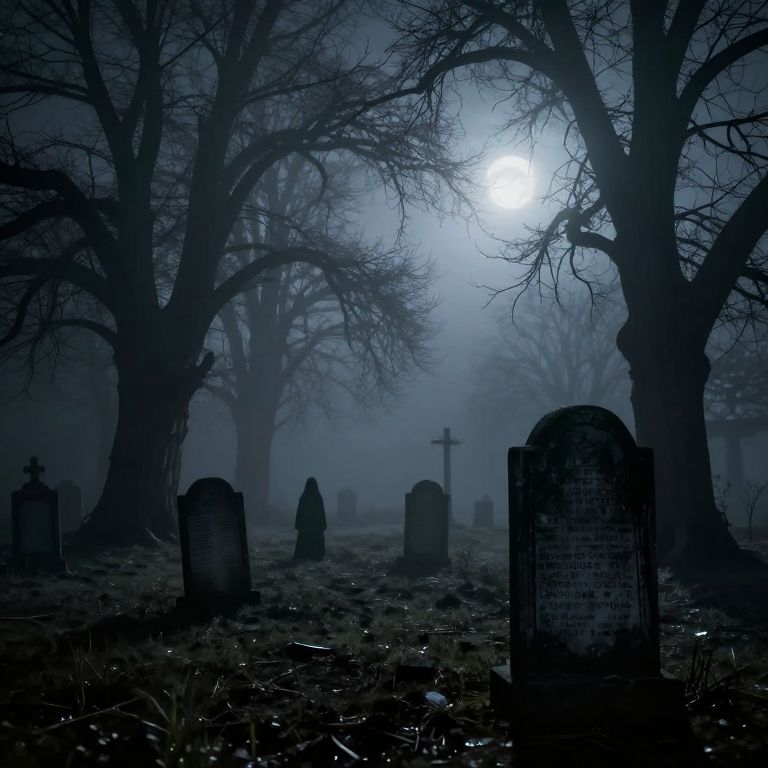 Scarry scene in a foggy graveyard at midnight, twisted trees casting eerie shadows, ghostly figures lurking, cracked tombstones with ancient symbols, pale moonlight breaking through dense mist, unsettling atmosphere, dark and haunting color palette