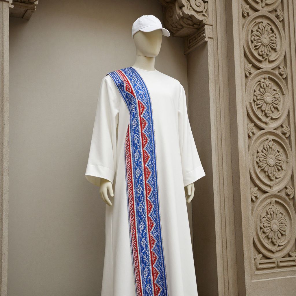 A tall, slender male mannequin wearing an elegant white robe that features a striking blue and red pattern on the left side, complemented by a crisp white hat on his head. He is posed standing in front of a grand building facade, which has an intricately decorative architectural design visible on the right side.