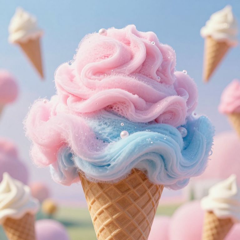 Fluffy ice cream haircut styled as luscious scoops in cotton candy pink and baby blue, topped with tiny swirl patterns and shimmering pearl highlights, surrounded by floating ice cream cones in a magical landscape, ethereal lighting, artistic concept.