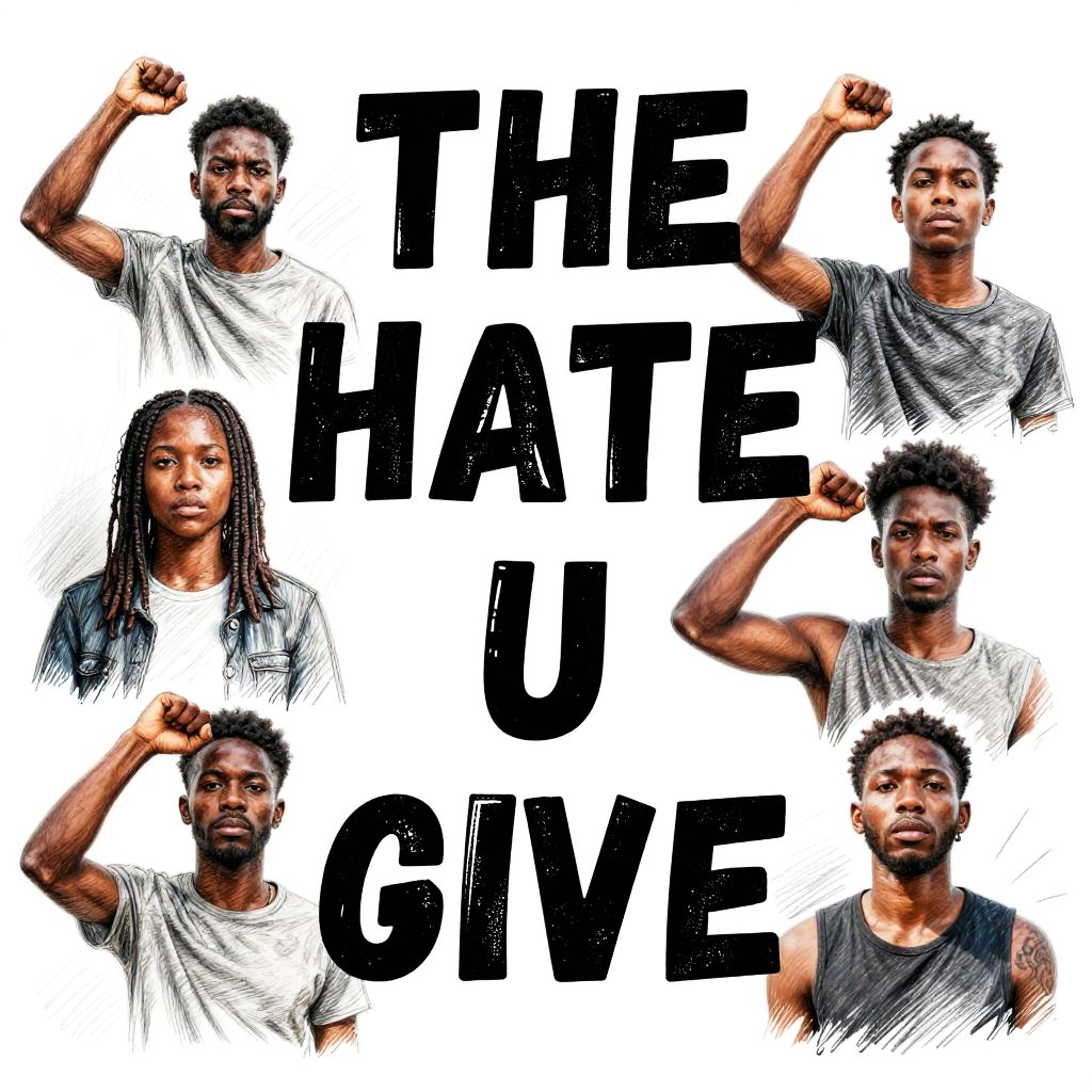Photograph of six Black men with varied hairstyles, raising fists, wearing grey shirts, against white background with bold "THE HATE GIVE" text