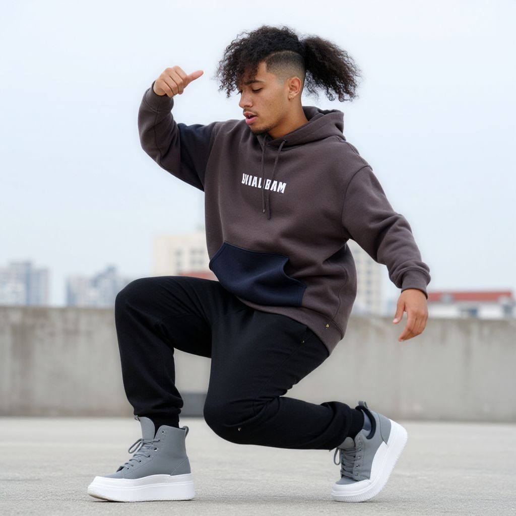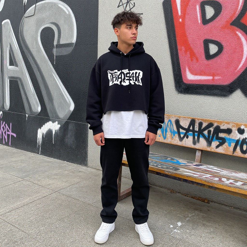 A striking portrait of a young man dressed in vibrant orange streetwear, posing confidently against a graffiti-covered wall. The urban setting and bold color palette emphasize the contemporary fashion style. This image captures the essence of modern street culture.