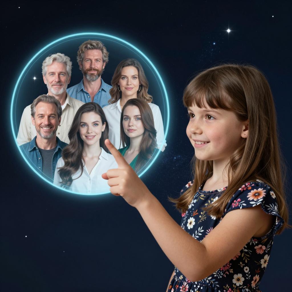 A young girl with light skin, brown hair with bangs, wearing a dark floral dress, pointing at a circular hologram of five adults with different hairstyles and clothing. Background is a ured blue and black starry pattern. The girl smiles slightly, and the adults in the hologram are closely grouped, smiling.