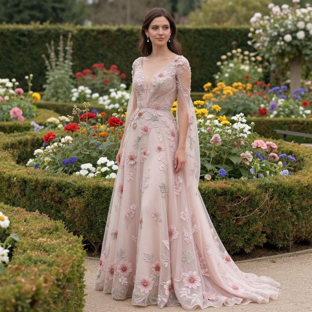 A woman stands gracefully in an elegant, flowing pink gown embellished with intricate floral embroidery, set against a beautifully manicured garden backdrop filled with vibrant flowers and neatly trimmed hedges. The romantic and ethereal composition highlights the harmony between the luxurious dress and the lush floral surroundings in soft natural light.