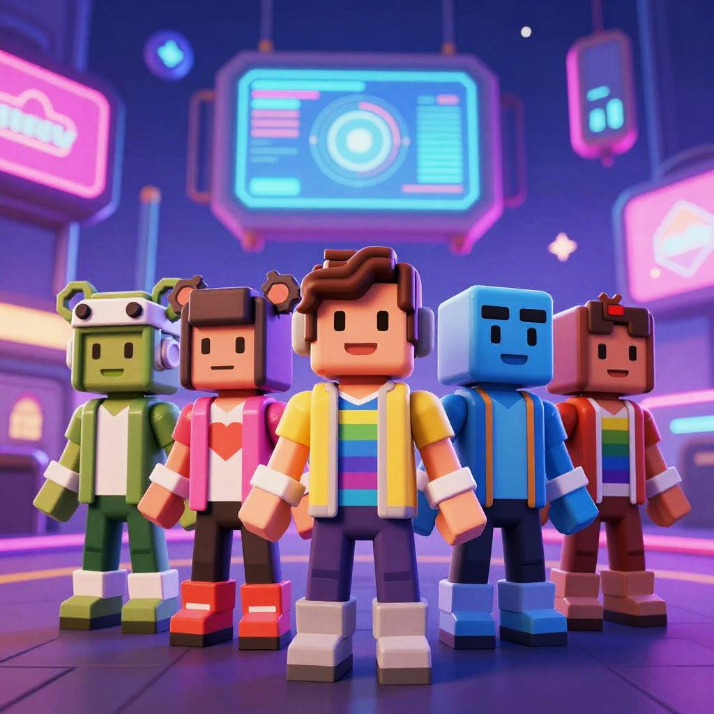 CGI image of five colorful, blocky, Minecraft-style characters with diverse outfits standing in a neon-lit futuristic cityscape. Bright, vibrant colors