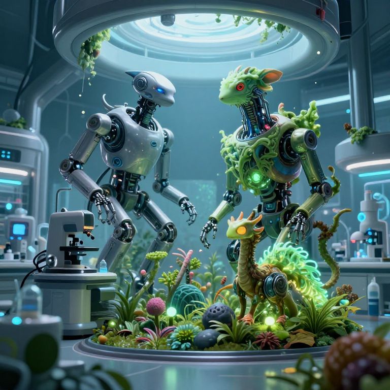 This is a highly detailed, digital CGI image depicting a futuristic laboratory scene. Two humanoid robots with metallic, silver-gray bodies and intricate joint mechanisms stand facing each other. The left robot has a sleek, modern design, while the right robot is adorned with vibrant green, plant-like appendages. Between them, a glowing, green dragon-like creature with yellow eyes and a long, winding tail is surrounded by a variety of colorful, alien plants. The background features a circular, illuminated ceiling and various high-tech equipment, including control panels and monitors. The lighting is cool and blue, enhancing the futuristic, sci-fi atmosphere.