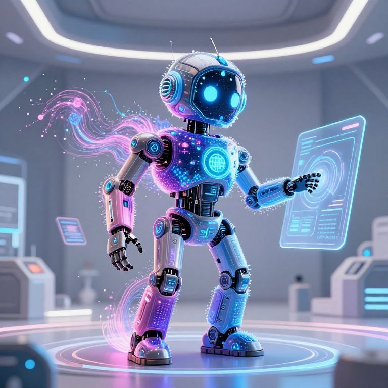 CGI sci-fi scene: Two metallic robots with one plant-covered, standing in a futuristic lab, surrounded by glowing, alien plants and a small green