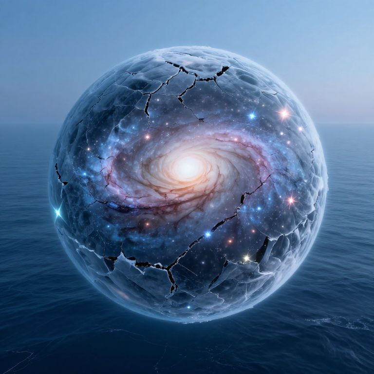 Celestial sphere reveals a luminous galaxy nestled within its cracked, icy surface, showcasing swirling cosmic rings and vibrant starlight against a serene ocean backdrop.