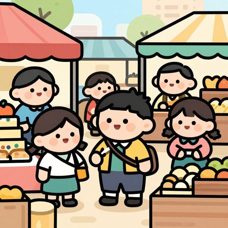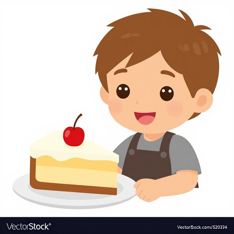 A cheerful cartoon-style illustration depicts a smiling boy with brown hair, wearing a green shirt and blue overalls, eagerly holding a fork as he leans toward a delicious strawberry-topped cake on a white plate, rendered in vibrant colors and smooth vector art.
