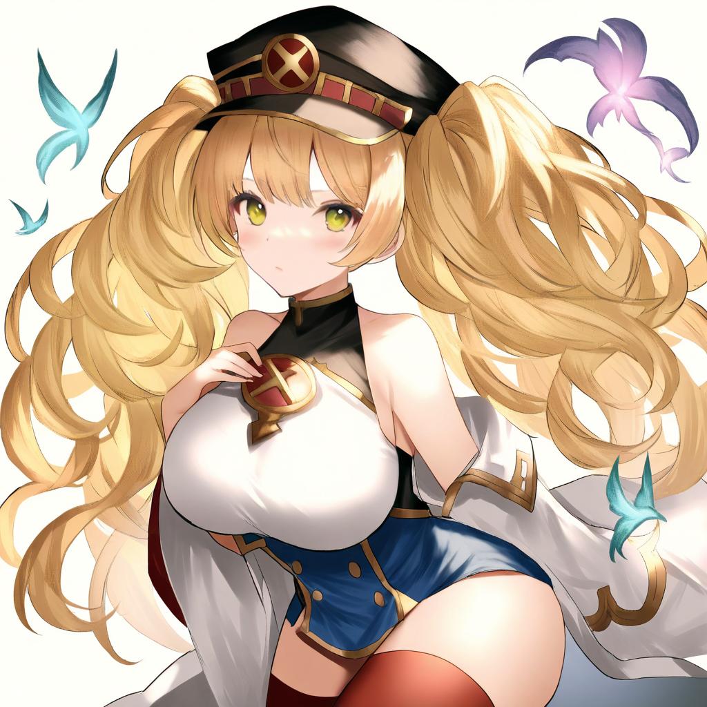Monika weisswind, granblue fantasy, 1girl, brown eyes, green eyes, blonde hair, long hair, wavy hair, twintails, ahoge, large breasts, thighs, peaked cap, bare shoulders, by artist sakizaki saki-p, animagine