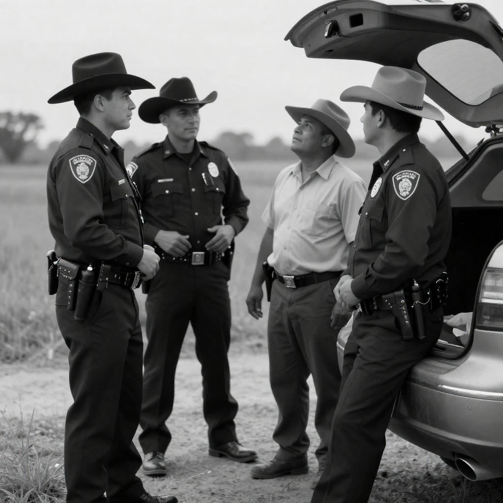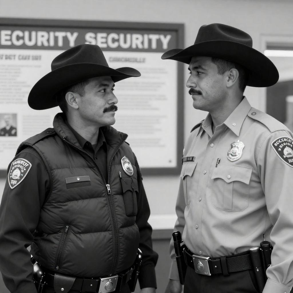 Black and white photograph of two male police officers in cowboy hats. One officer wears a puffy vest, the other an open shirt with a badge. They stand facing each other, with the puffy vest officer slightly shorter. Background includes a security literature display. The taller officer has a slight smile, the shorter one looks serious. Both have visible mustaches.