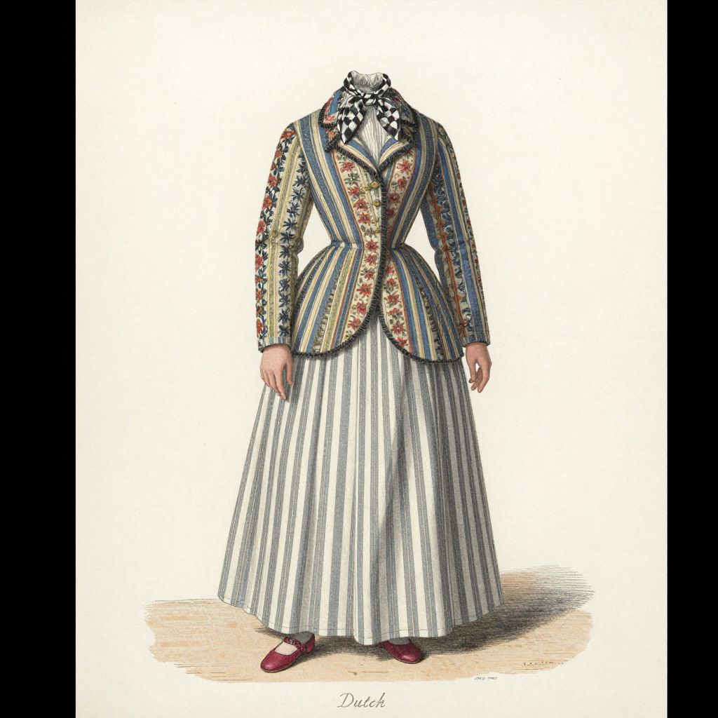 \"1770s - 18th century - woman's outfit with mixed print fabrics (jacket in stripes with flowers in between stripes, skirt in stripes, neckerchief in plaid/checks) - From \"\"An album containing 90 fine water color paintings of costumes.\"\" Turin : [s.n.] , [ca.1775]. In the collection of the Bunka Fashion College in Japan. Underneath the illustration the word \"\"Dutch\"\" is handwritten in pencil. - Netherlands\
