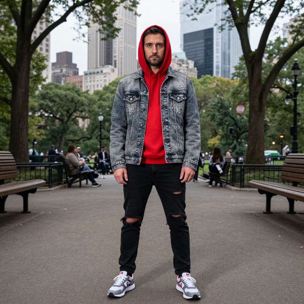 A man, acid wash denim jacket, bright red hoodie, black ripped jeans, retro running shoes, urban park, tree-lined trails, bustling city skyline, camera obscura style, contemplative expression Man has masculine face and piercing eyes