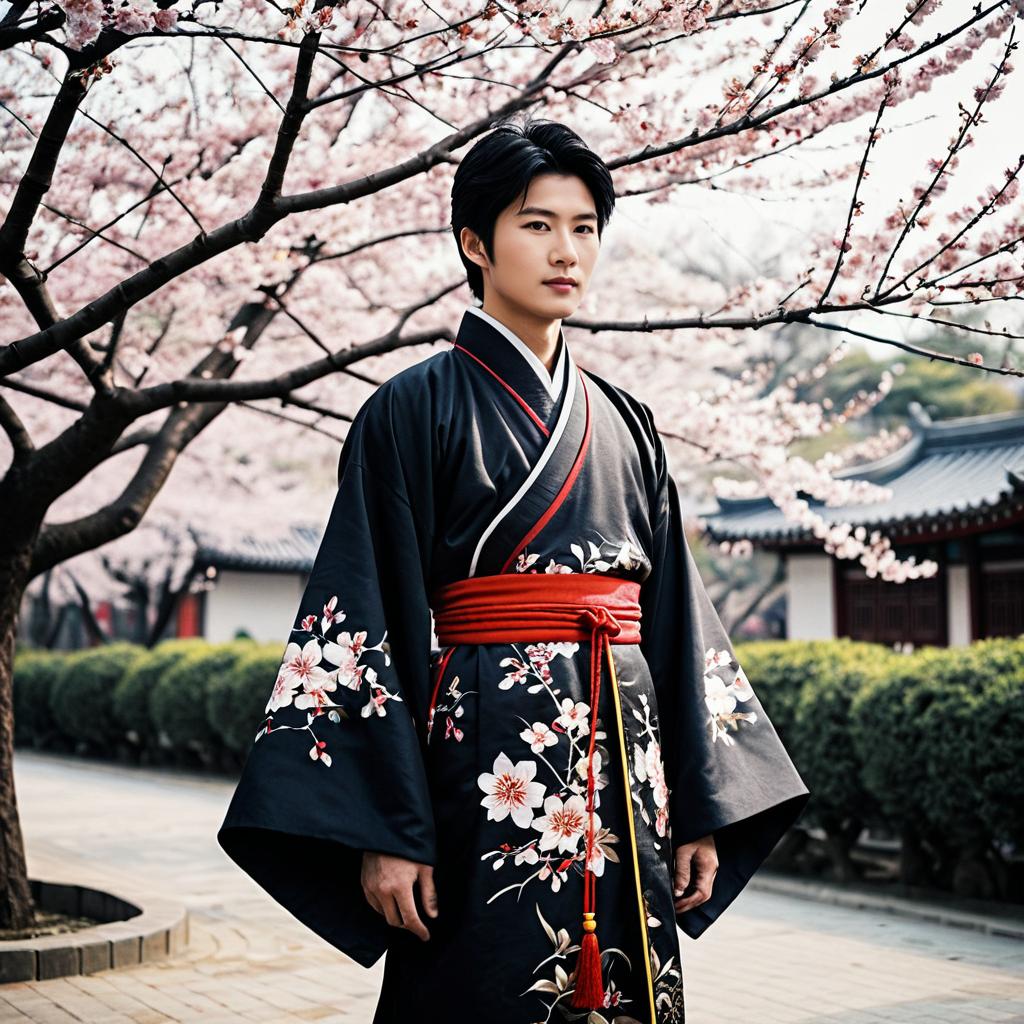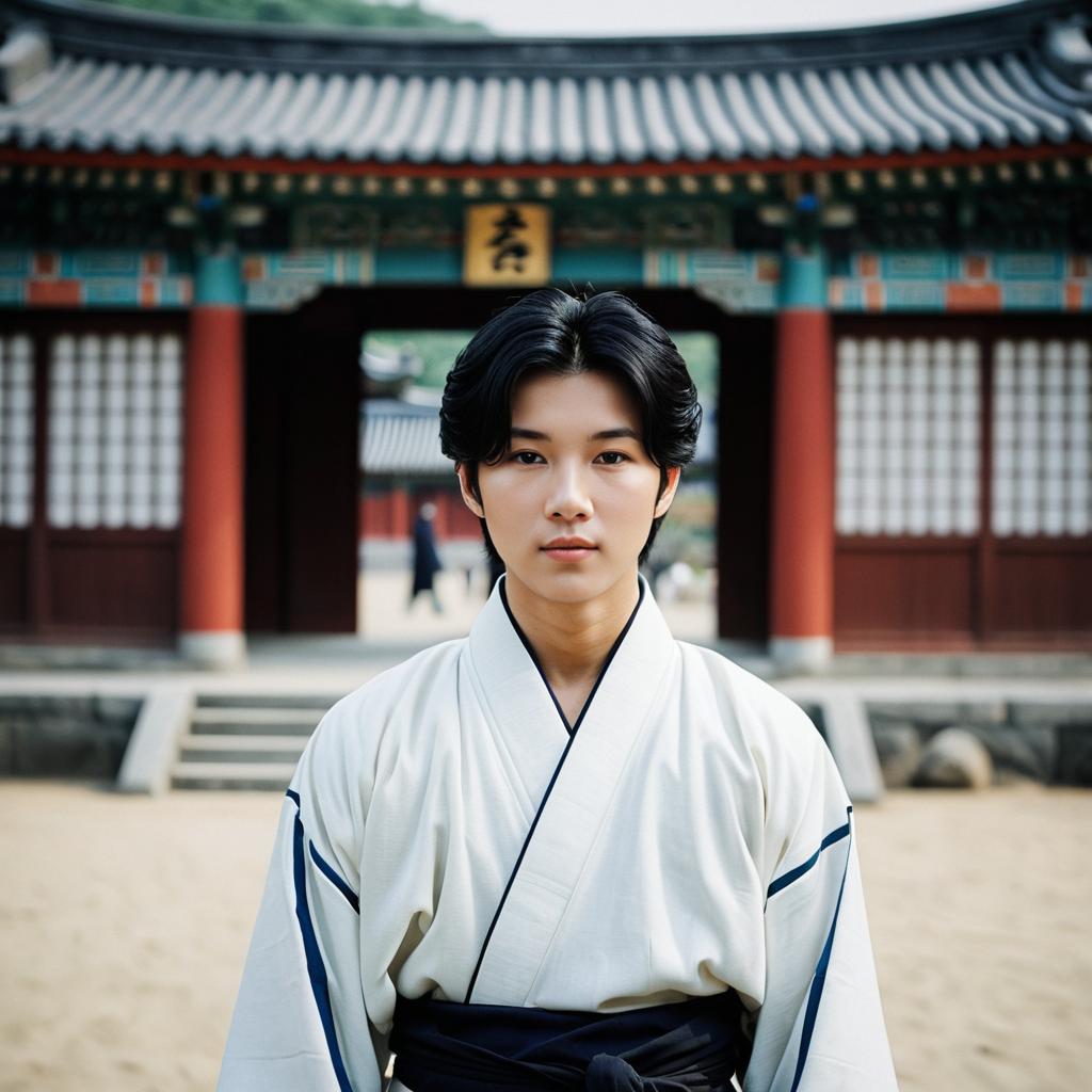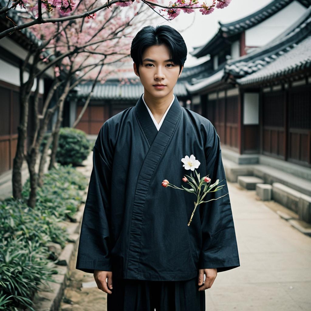 Young Man in Traditional Korean Attire with Flower