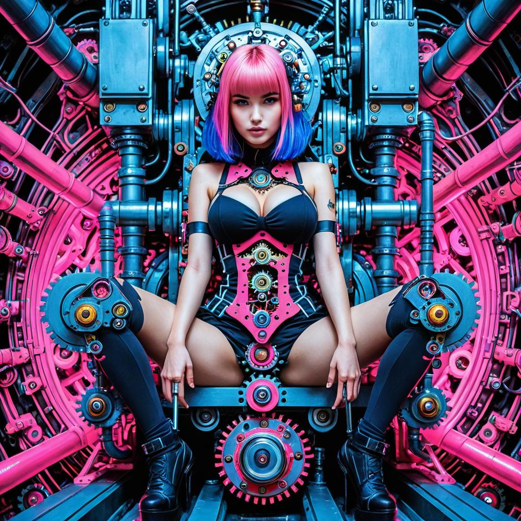 A highly detailed, digital CGI artwork features a young Asian woman with vibrant pink and blue bob-cut hair, sitting in a futuristic mechanical chair. She wears a black, strappy, cleavage-revealing outfit with metal gears and a corset-like design, black thigh-high boots, and a headpiece. Her legs are spread apart, hands resting on her thighs. The background is a complex, neon-lit machine with pink and blue gears, tubes, and mechanical parts, creating a cyberpunk aesthetic. The image has a high-contrast, hyper-saturated color palette, emphasizing the futuristic and mechanical elements.