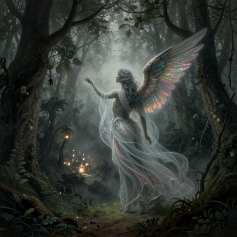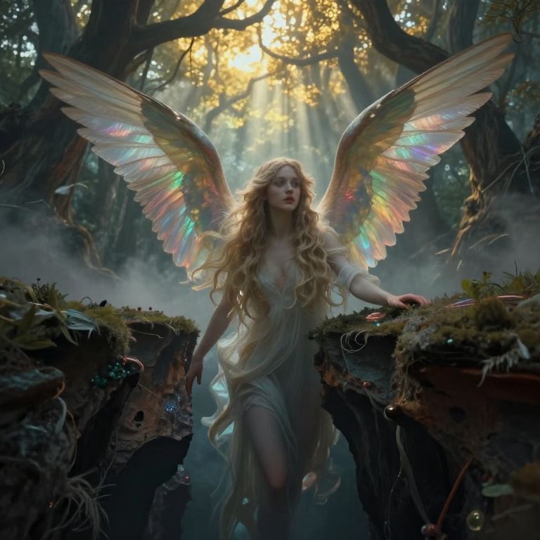 A dreamlike landscape showcasing an ethereal figure with iridescent wings and a radiant aura soaring above a misty primeval forest, embodying the delicate balance between the fantastical and natural worlds. Towering trees intertwine with floating islands of clouds, creating an otherworldly portrait that invites viewers on an imaginative journey beyond the visible spectrum, reminiscent of surreal dreamscapes painted in a unique fusion of fantasy and realism.