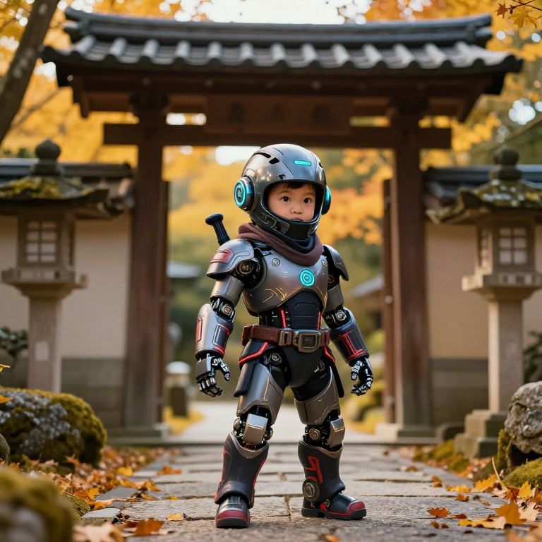 In a breathtakingly detailed and hyper-realistic scene, a futuristic ninja robot toddler stands confidently in a Japanese garden, exuding an air of mystery and advanced technology. The robot, adorned in a meticulously crafted suit with neon accents, is positioned in front of a traditional Japanese gate, its intricate design and glowing eyes reflecting a futuristic aesthetic. The garden, bathed in warm, golden hues, features a stone path lined with autumn leaves, adding a touch of nature's beauty to the high-tech ambiance. The composition is masterfully crafted, with the robot and gate serving as the focal points, surrounded by a beautifully color-graded environment that enhances the cinematic quality of the scene. The overall atmosphere is one of harmony between the ancient and the advanced, creating a visually stunning and dynamically posed image that captures the essence of a futuristic ninja in a traditional setting.