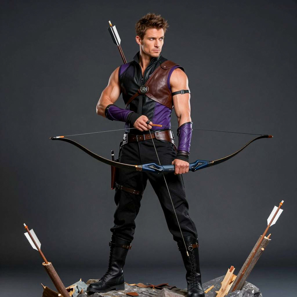 Photo of a muscular man with short brown hair, wearing a black and purple archer outfit with leather straps, holding a black bow. He stands on a rock with broken wooden arrows. Background is dark and blurred. His expression is determined. Quiver with arrows is on his back. He's wearing black boots and gloves. The man has a strong jawline and a focused look. One strap on his left arm is slightly loose. He's holding the bow with both hands, fingers gripping the strings.