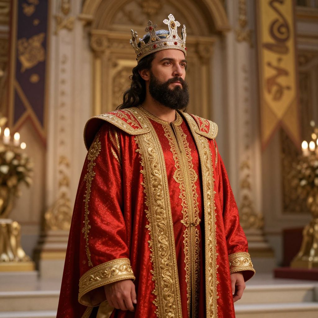 A distinguished man with a full, well-groomed beard, a majestic silver-and-gold crown resting proudly on his head, and a vibrant red and gold ceremonial costume that flows with intricate embroidery and rich textures, highlighting his regal presence. He stands confidently in a grand, ornate setting—filled with elaborate architectural details, ornate columns, and flowing banners—exuding strength, authority, and timeless elegance. The lighting is warm and dramatic, casting soft golden highlights across the fabric and his noble features, emphasizing the depth of his expression and the richness of the colors. The scene is bathed in a luxurious, cinematic glow, evoking a sense of ancient power and imperial splendor.