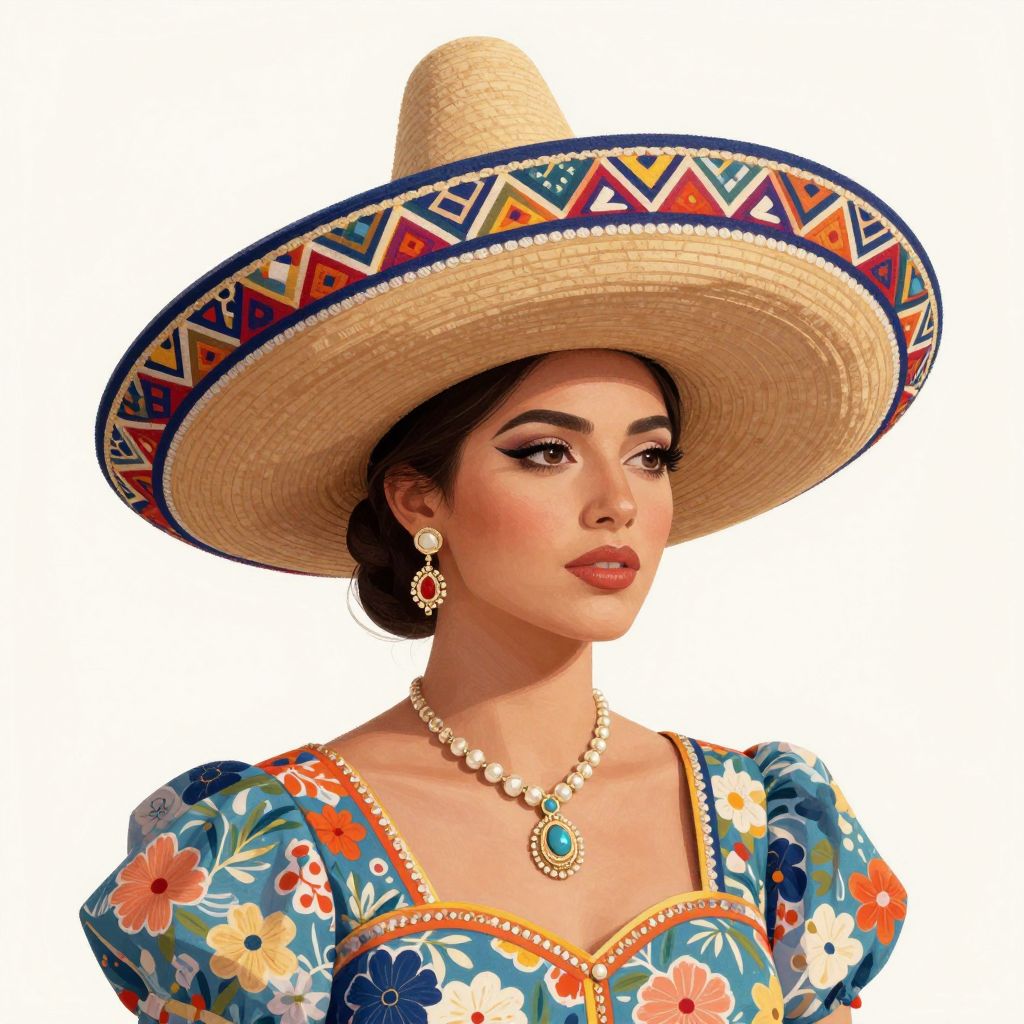Digital illustration of a fair-skinned woman with dark brown hair wearing a large, colorful Mexican sombrero adorned with geometric patterns. She has dark, well-defined eyebrows, red lipstick, and is looking to the right. She wears a blue dress with orange, white, and yellow floral patterns, puffed sleeves, and a square neckline. Her jewelry includes a gold necklace with a green gemstone pendant, matching earrings, and a gold ring on her right hand. The background is plain white, emphasizing her vibrant attire and accessories. The style is realistic with a slight cartoonish flair.