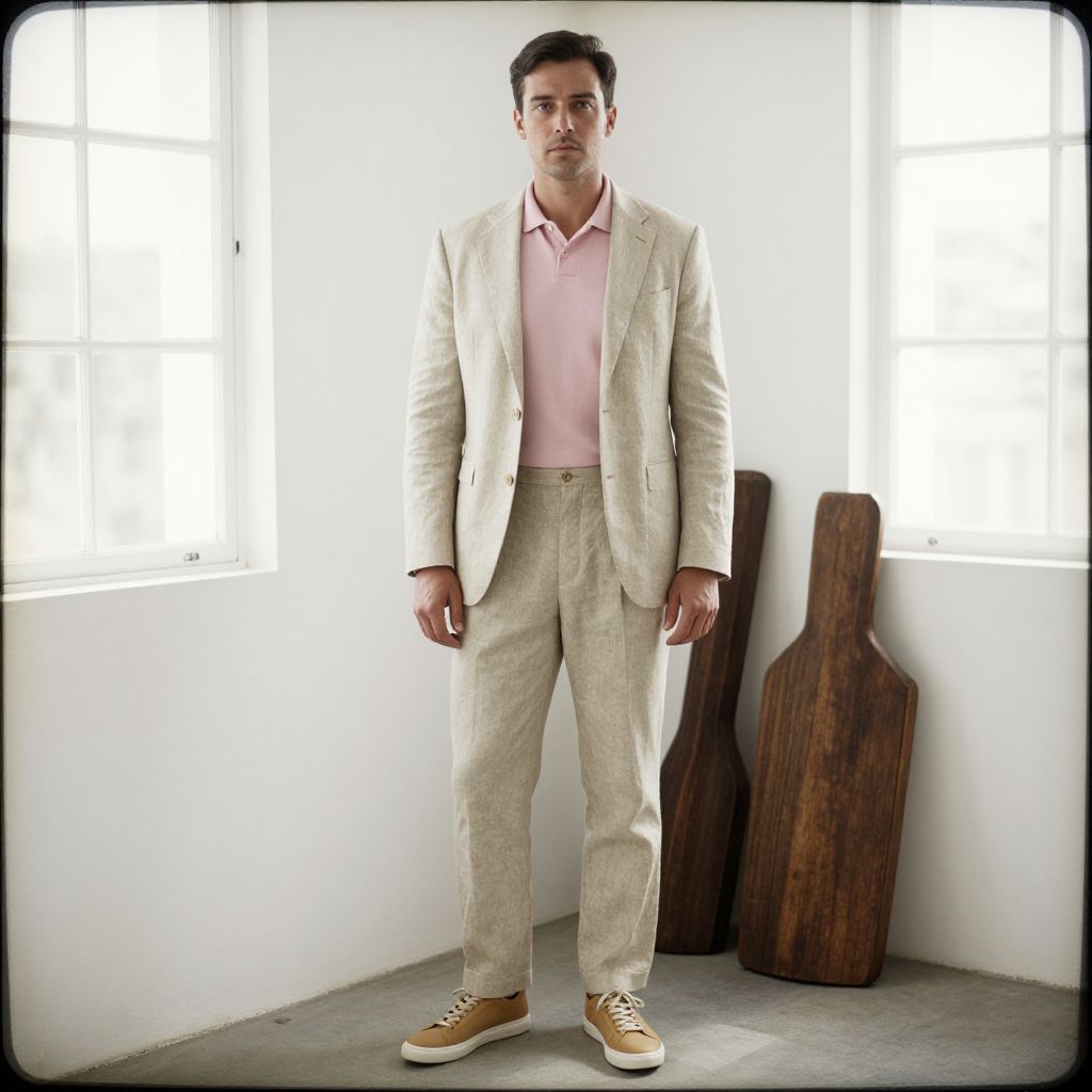 A man, beige linen suit, pastel pink polo shirt, tan leather sneakers, unstructured fit, moisture-wicking fabric, bright white walls, large north-facing windows, vintage wooden props, collodion wet plate style, relaxed expression. Man has masculine face and piercing eyes