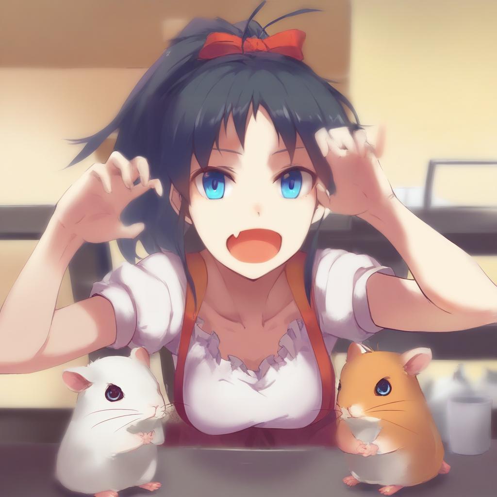Hamuzou, idolmaster, 1girl, fang, blue eyes, black hair, long hair, antenna hair, ponytail, hair ribbon, medium breasts, hamster, animal, by artist fangdan runiu, leet