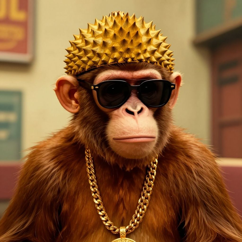 Portrait of a monkey with a durag in vintage hip-hop style, wearing gold chains and sunglasses, retro urban backdrop, warm tones, artistic and stylized