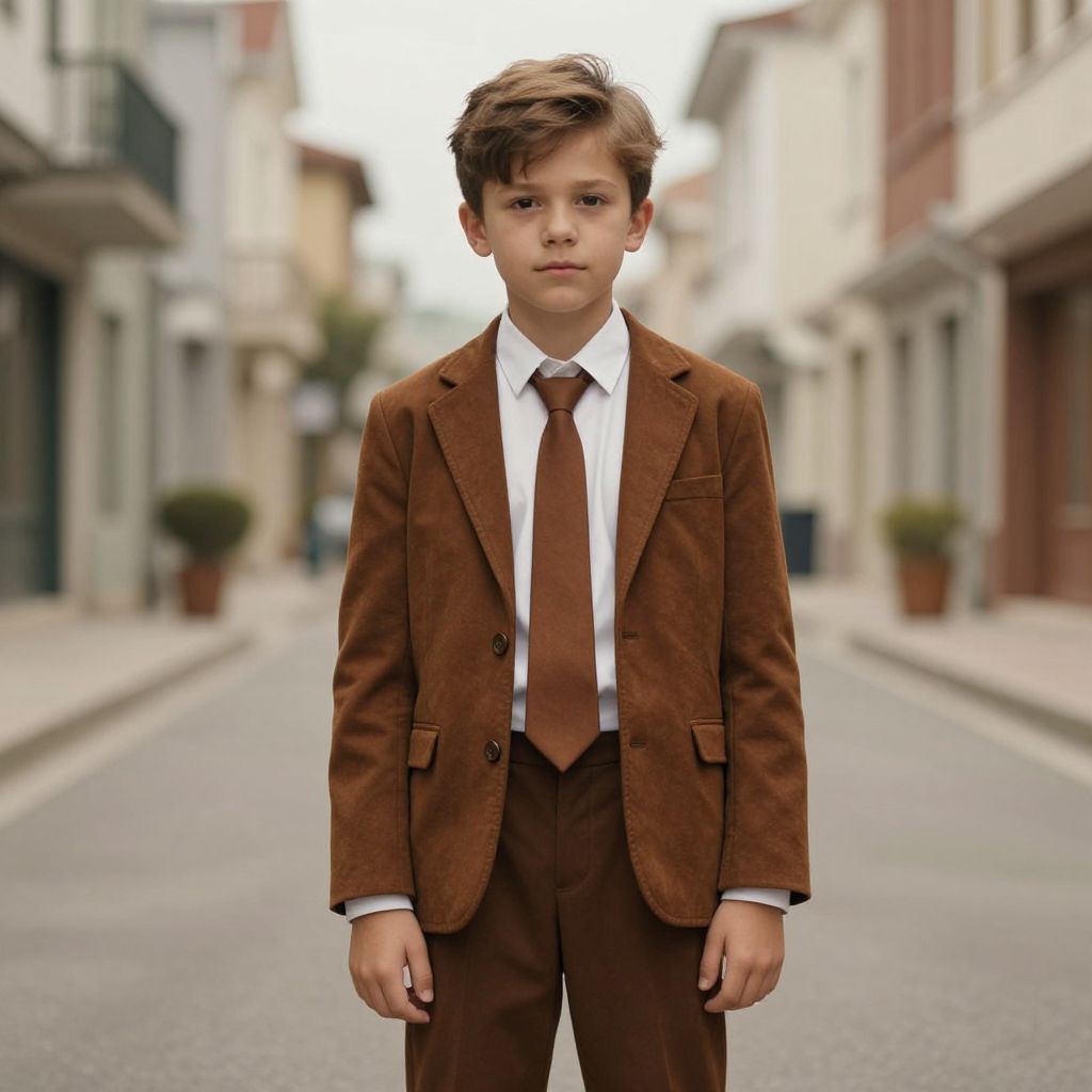 Retro Costume Boy, boy with brown jacket and tie standing in street with buildings in background