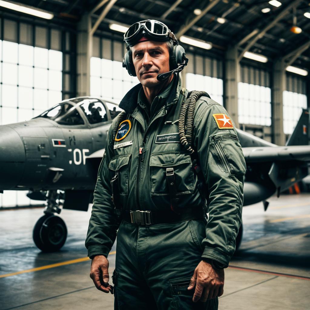 Man Fighter Pilot, man in a pilot's uniform and goggles standing in a hangar