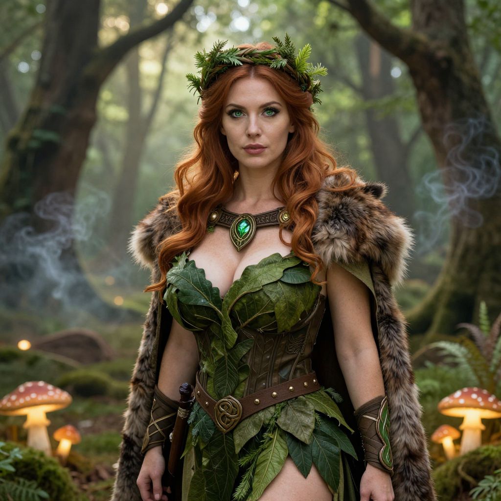 A beautiful woman with flowing auburn hair, deep green eyes, and a serene, mystical expression wears a detailed Celtic druidess costume featuring a green leafy tunic, wild boar fur cloak, and a woven wreath of herbs, standing in a lush green mystical forest at dawn, surrounded by glowing mushrooms and ancient trees with ethereal smoke rising from the ground, sunlight filtering through the canopy, realistic photography style. The woman has big tits and cute face