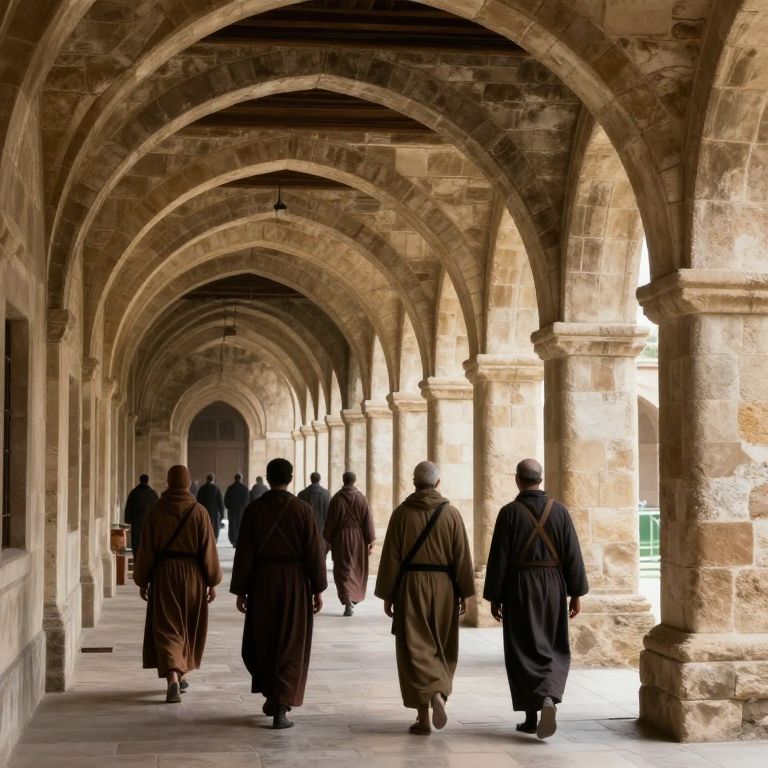 Pilgrims Walking Through Ancient Stone Arches