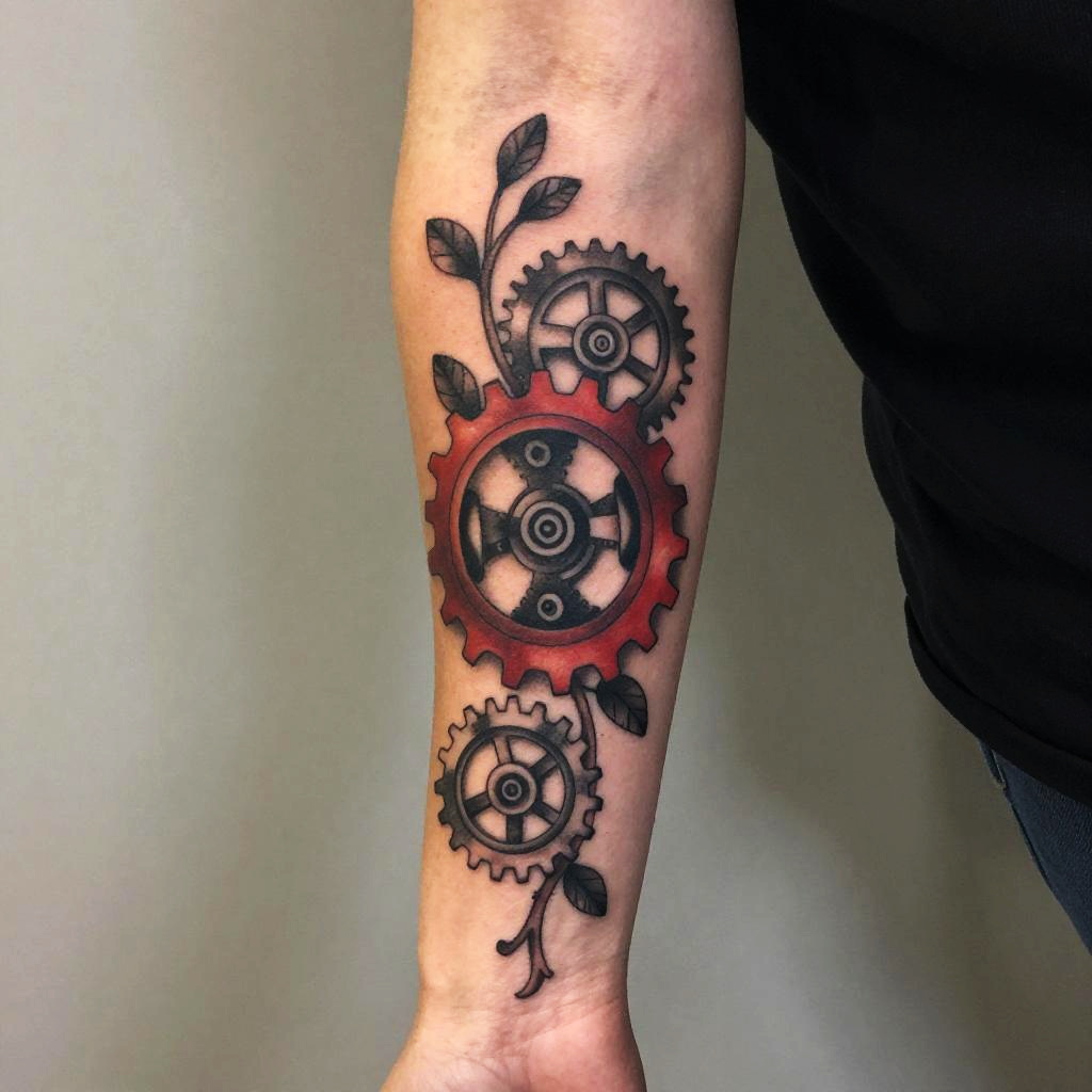 Red and black forearm tattoos depicting a blend of natural and mechanical elements, like gears and vines entwined, rendered with fine detail and subtle gradients, framed in a studio shot with neutral background for emphasis.