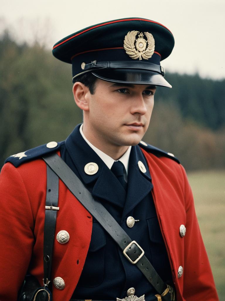 Portrait of a young male dressed in a royal soldier costume featuring a navy blue military uniform with gold buttons, a red cape, black gloves, a matching hat with a gold emblem, and a leather belt and sheath. The soldier is holding a sword and standing in front of a stone background, looking directly at the viewer.