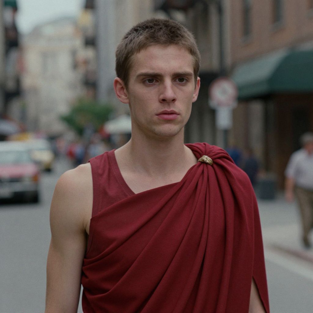 A skinny man in red drapery in an antic city, cinestill 800 t eastmancolor technicolor, high quality, very detailed, heavy grain, fine facial features, 8 k, octane render, unreal engine