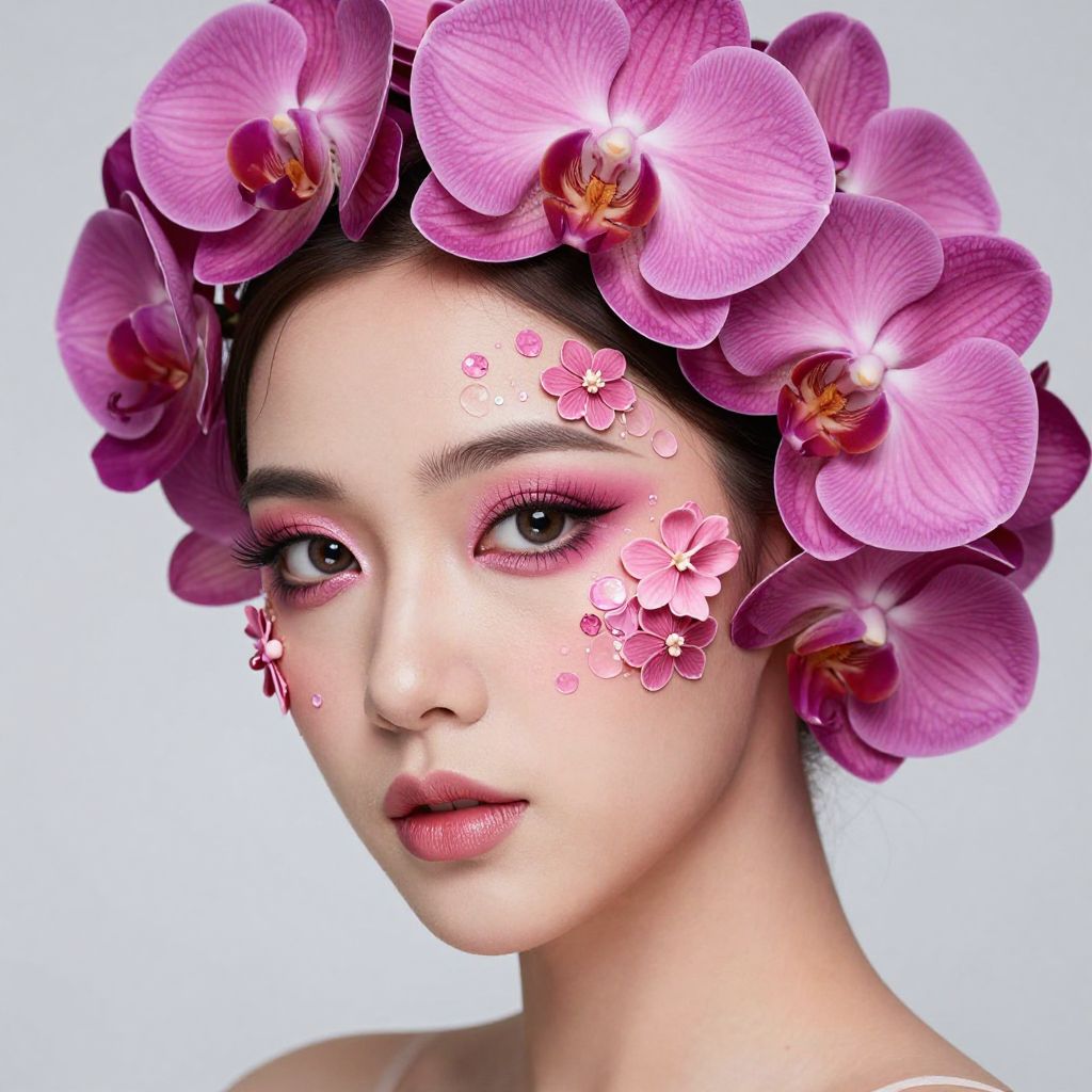 Orchid-Adorned Woman with Floral Makeup