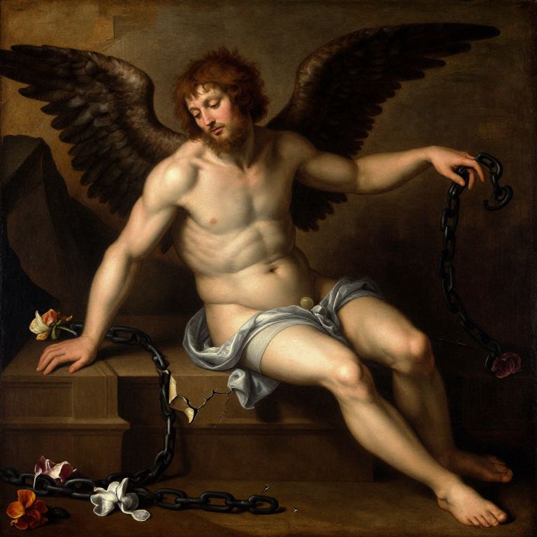 This is a digital painting of a muscular, bearded angel with curly brown hair, dark brown wings, and light skin, sitting on a stone pedestal. He is nude except for a loosely draped white cloth around his waist. His right hand holds a broken chain with a flower in his left hand. The angel's expression is somber, and his gaze is downward. The background is dark brown, emphasizing his illuminated form. At his feet, there are scattered white and red flowers. The overall style is reminiscent of Baroque art, with dramatic lighting and realistic textures.