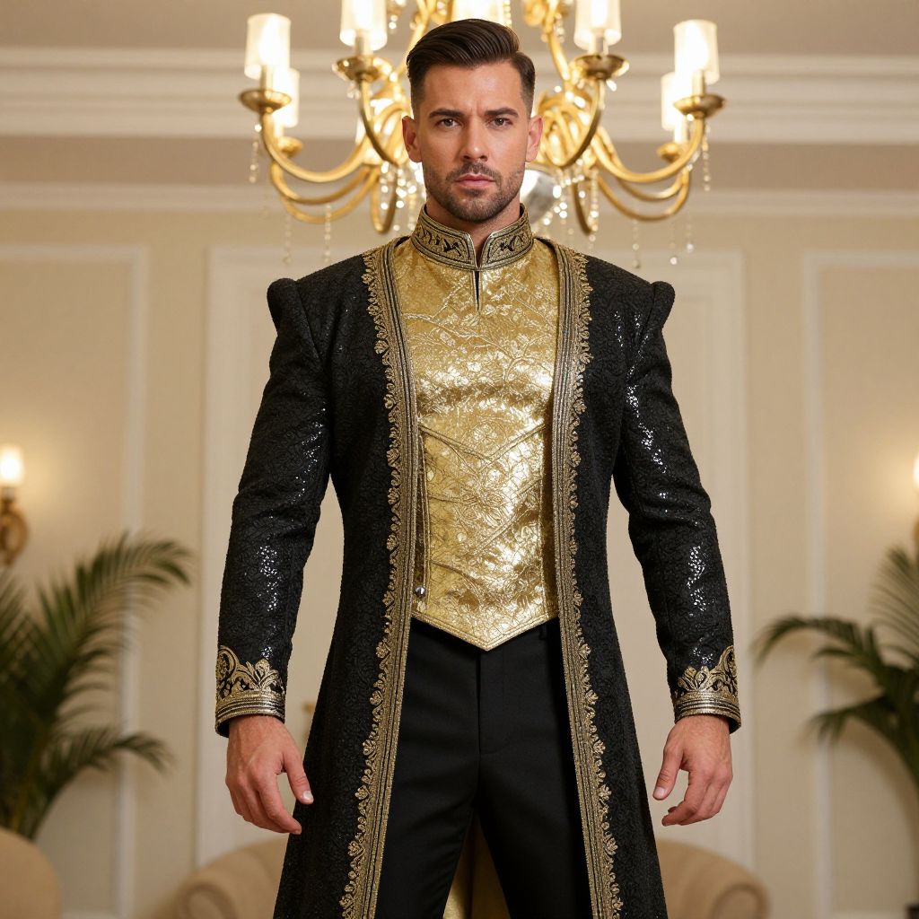 Photograph of a handsome man with short, dark hair and a trimmed beard, standing confidently in an elegant room. He wears a black, long-sleeved, ornate jacket with gold embroidery over a shiny, gold, high-collared shirt and black pants. A luxurious chandelier with multiple candles hangs in the background, casting a warm glow. The room features cream-colored walls with decorative molding and two potted palm plants on either side. His strong, muscular build and serious expression add to his commanding presence. The overall style is sophisticated and regal.